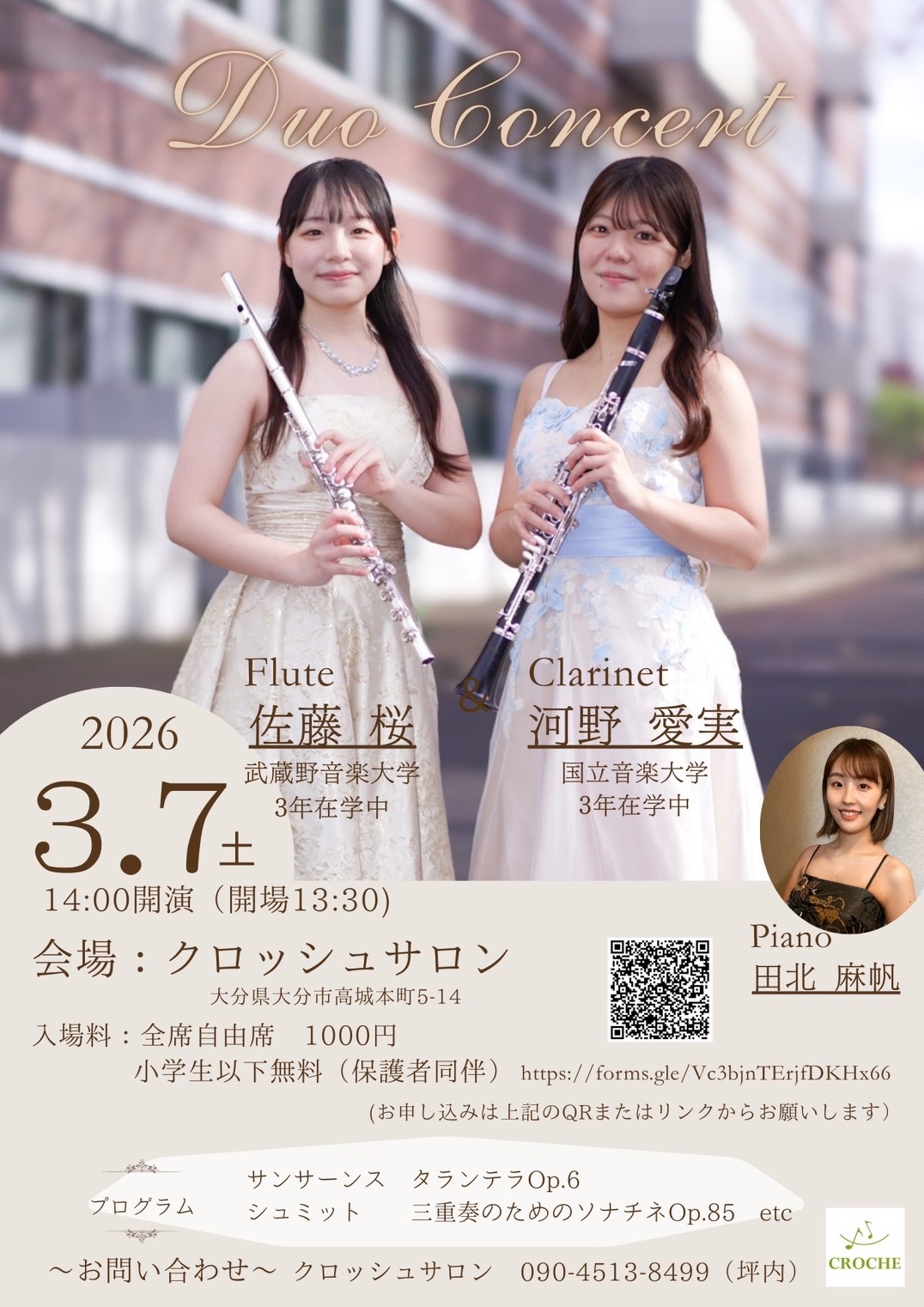 フルート佐藤桜さん(武蔵野音大3年)クラリネット河野愛実さん(国立音大3年)のお二人によるデュオリサイタルを2026年3月7日(土)14:00〜開催します(開場13:30)